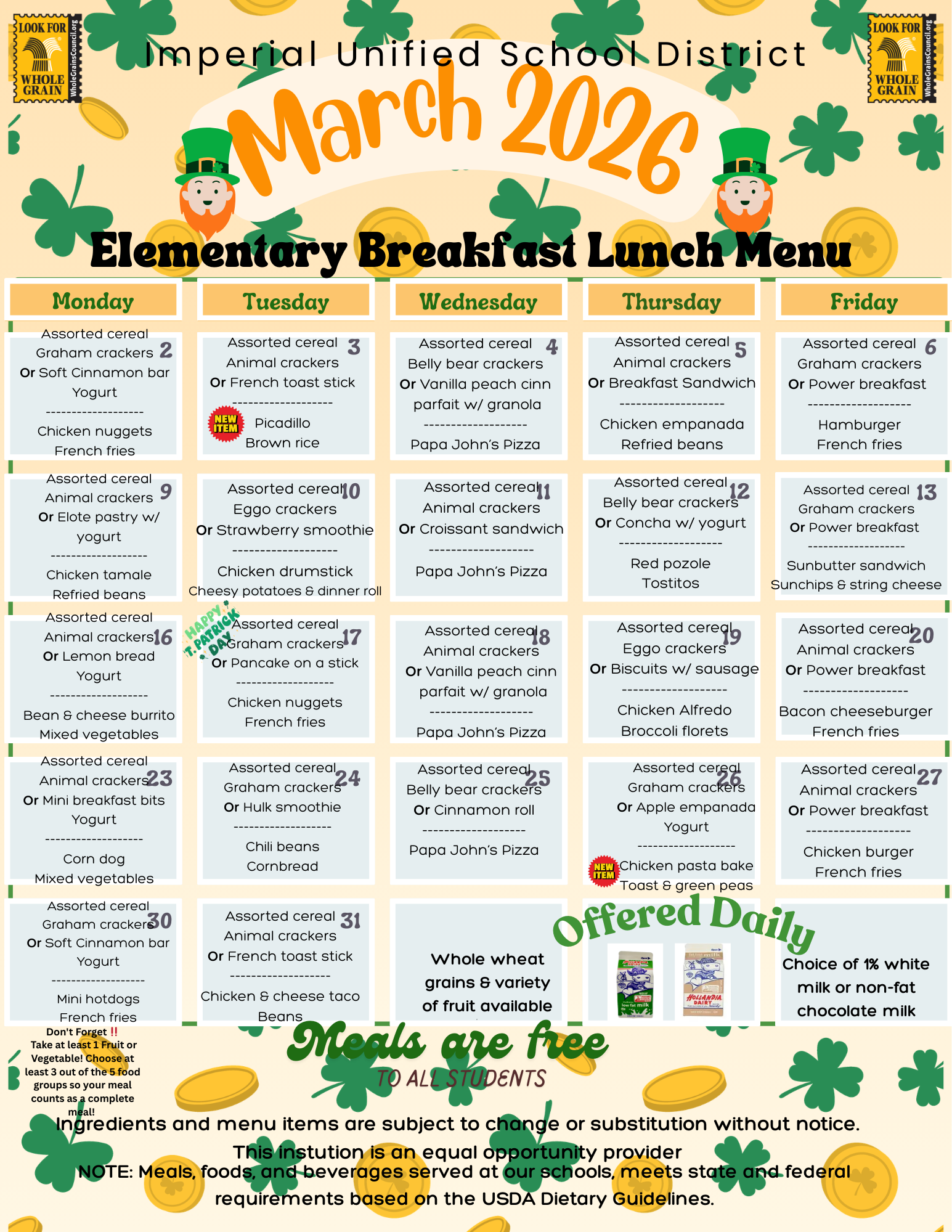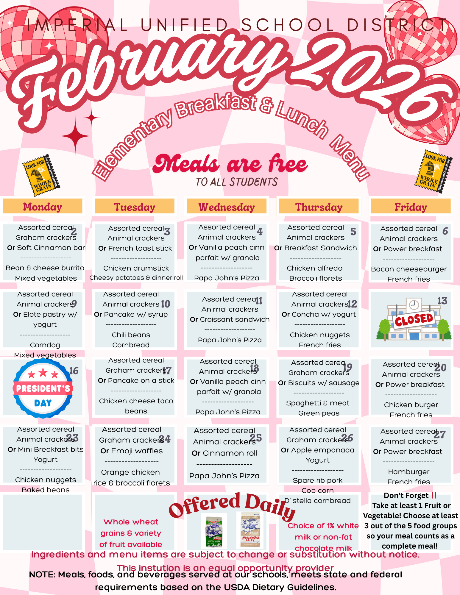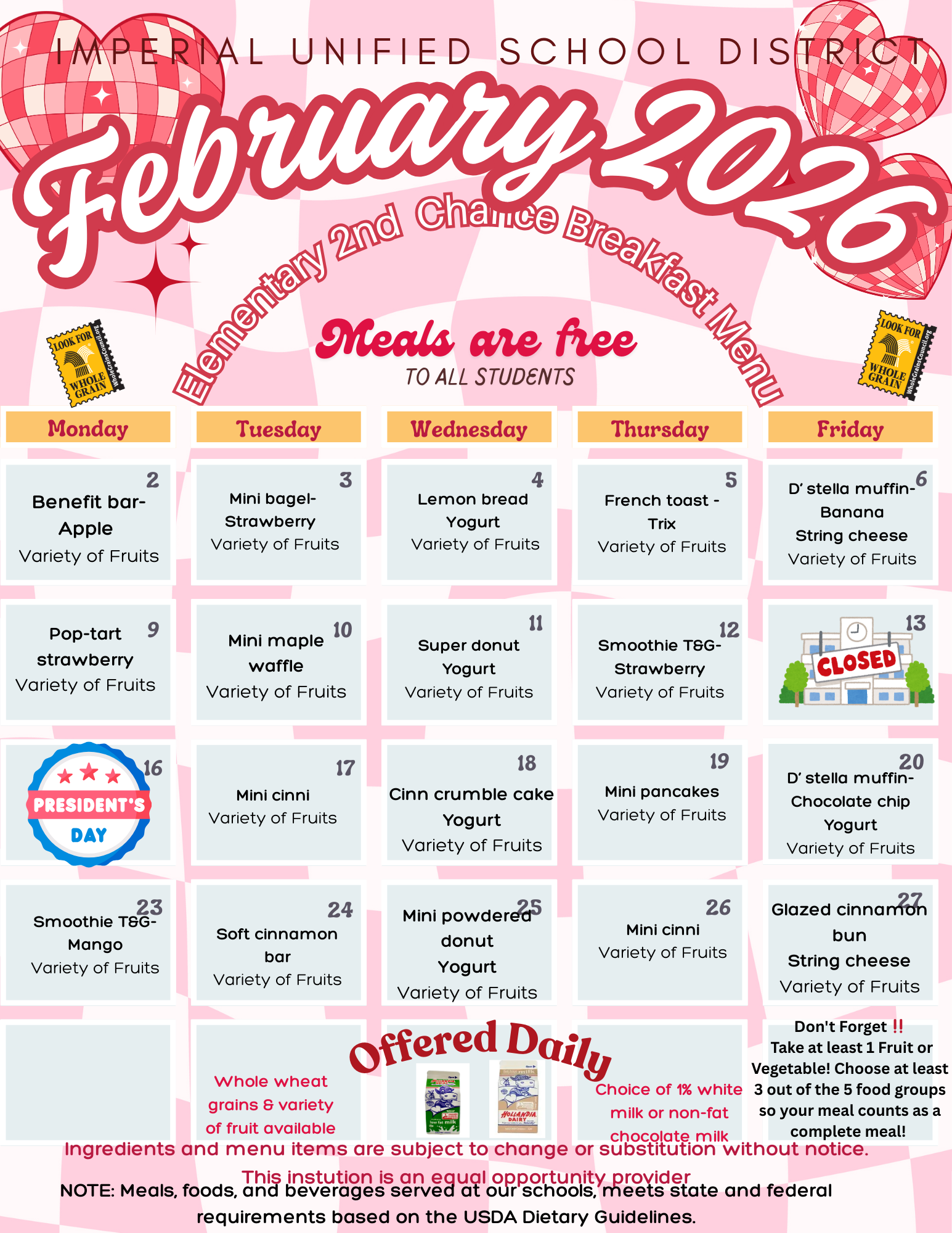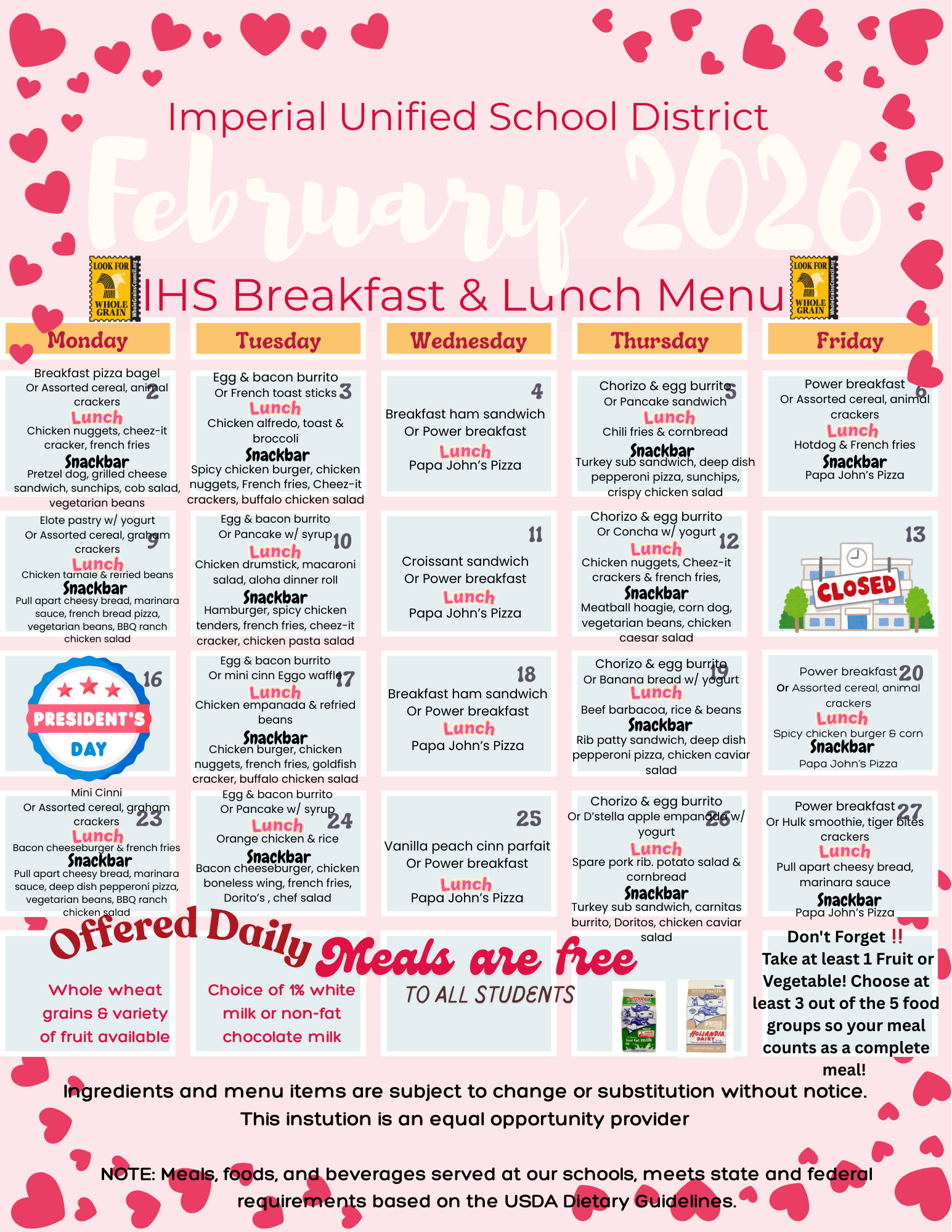 All students enrolled in the Imperial Unified School District will receive free breakfast and lunch for the 2025-2026 school year. For school funding, all families must submit an application.