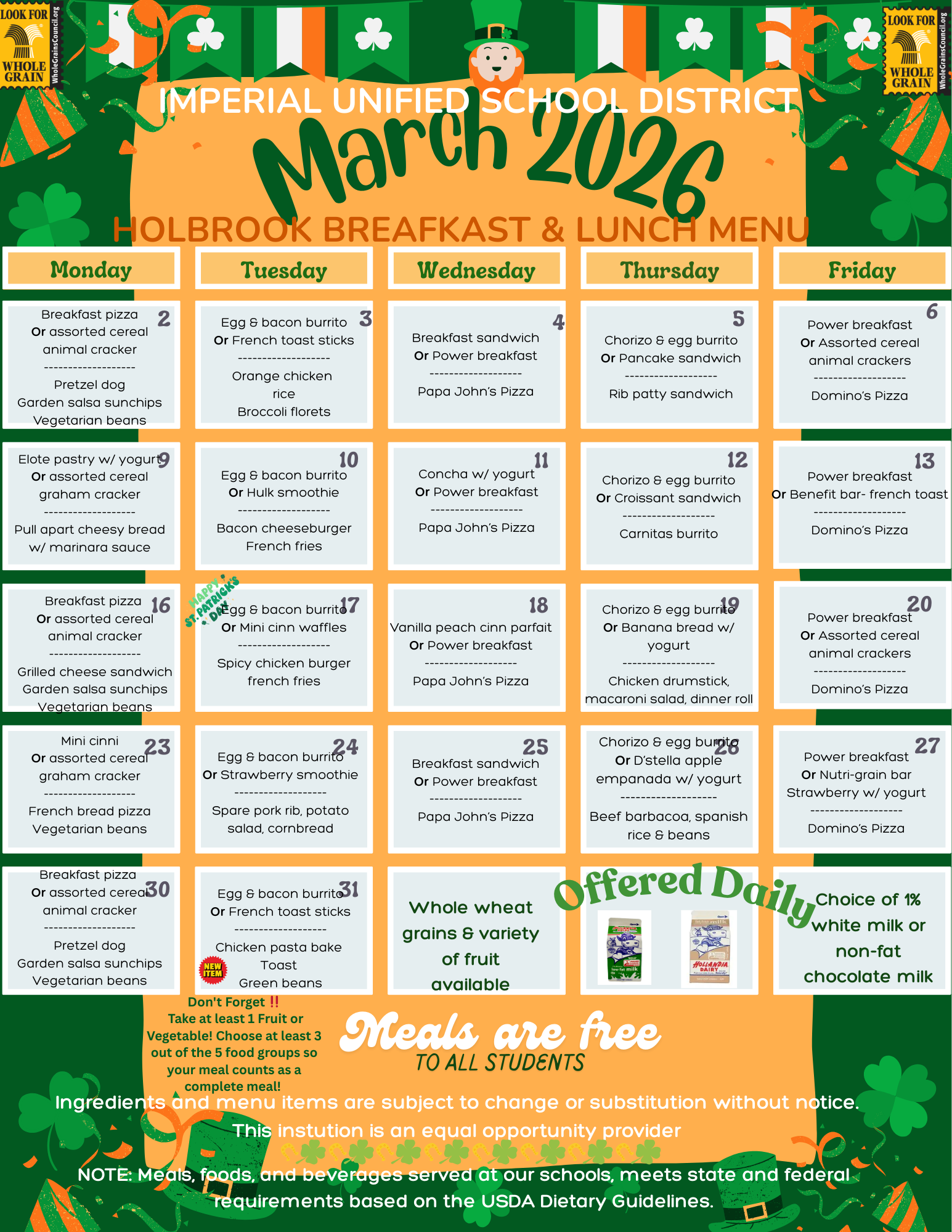 Holbrook High School Food Menu (Breakfast / Lunch)