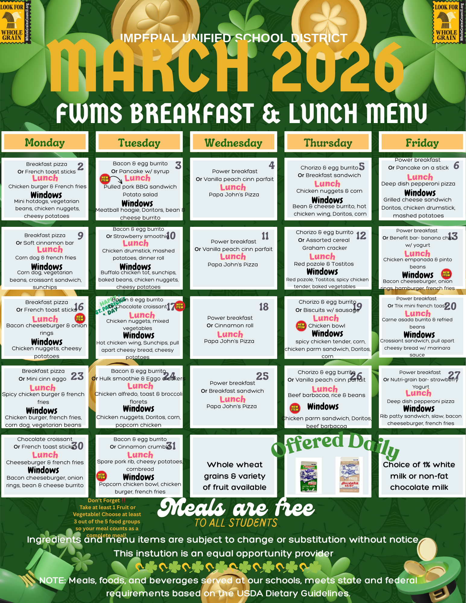 Frank Wright Middle School Food Menu (Breakfast / Lunch)