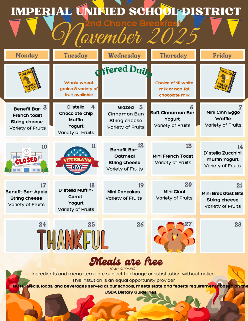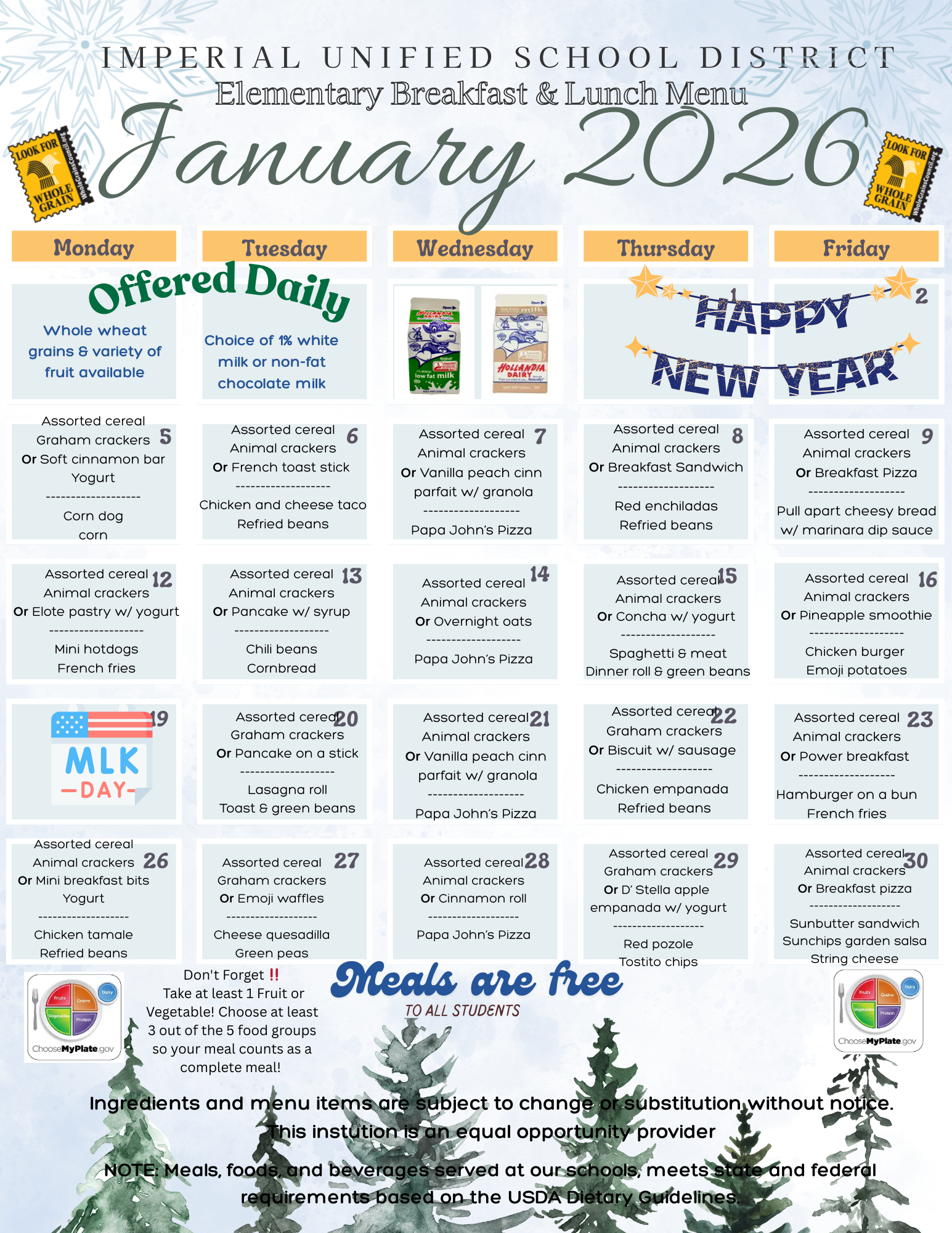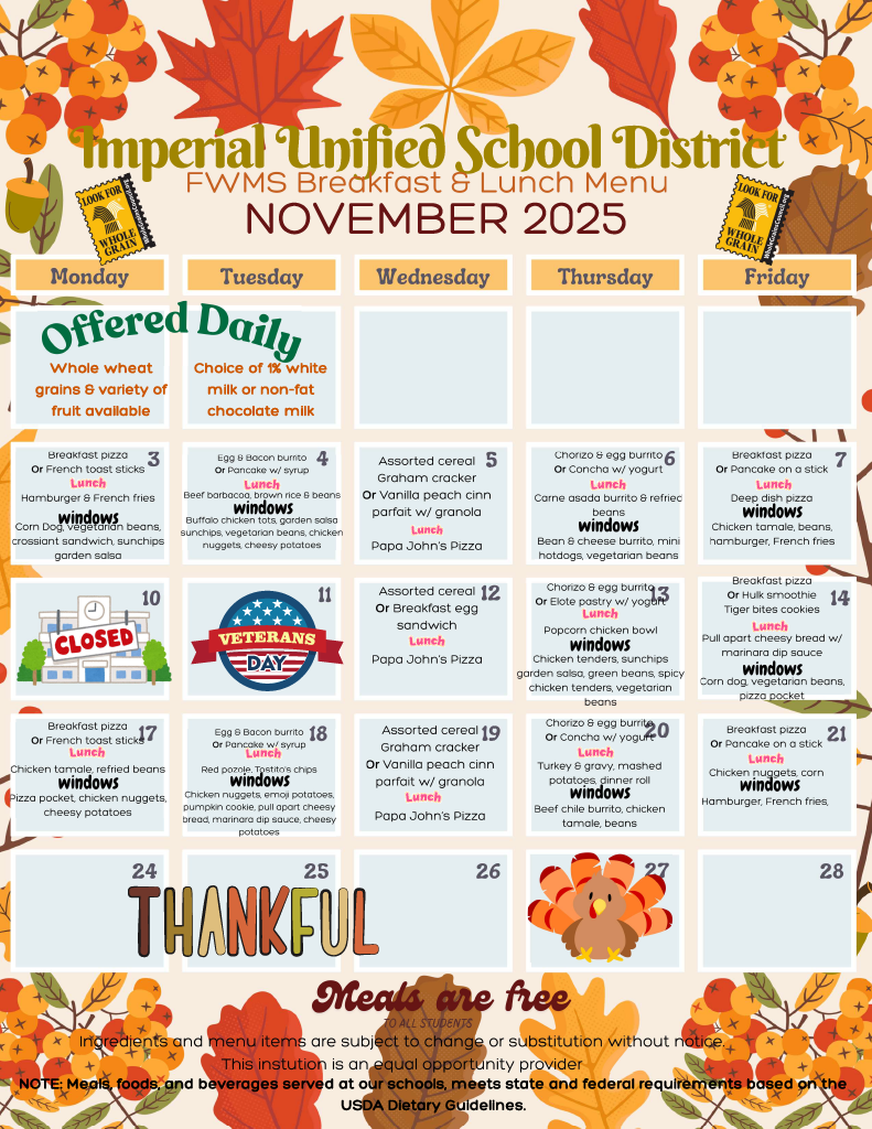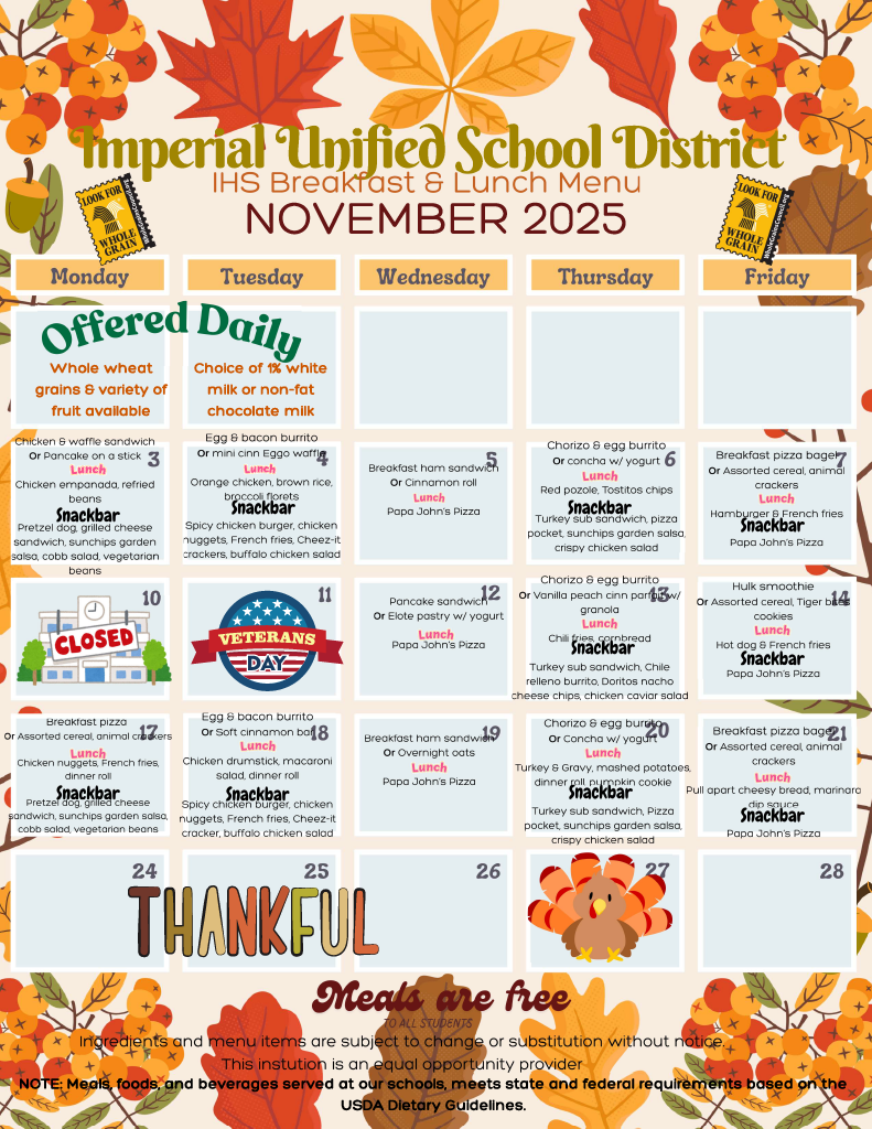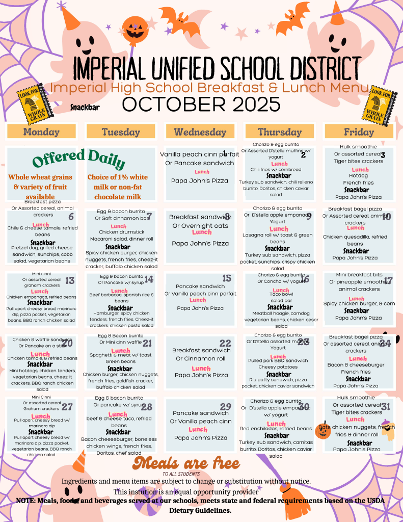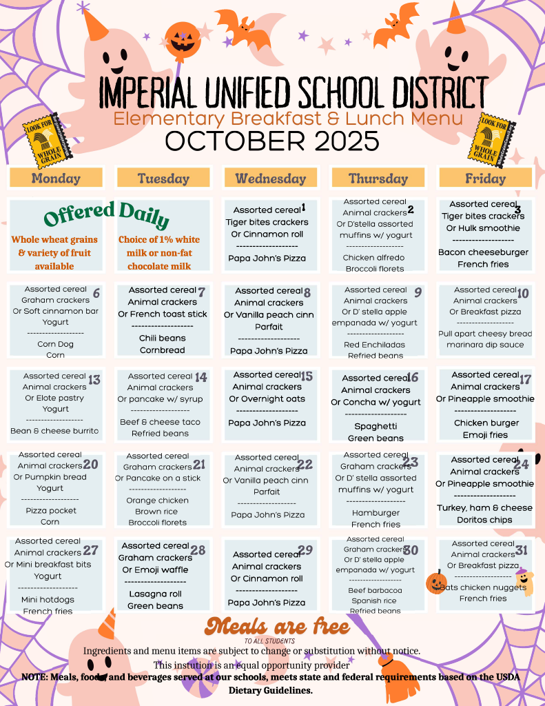 All students enrolled in the Imperial Unified School District will receive free breakfast and lunch for the 2025-2026 school year. For school funding, all families must submit an application.